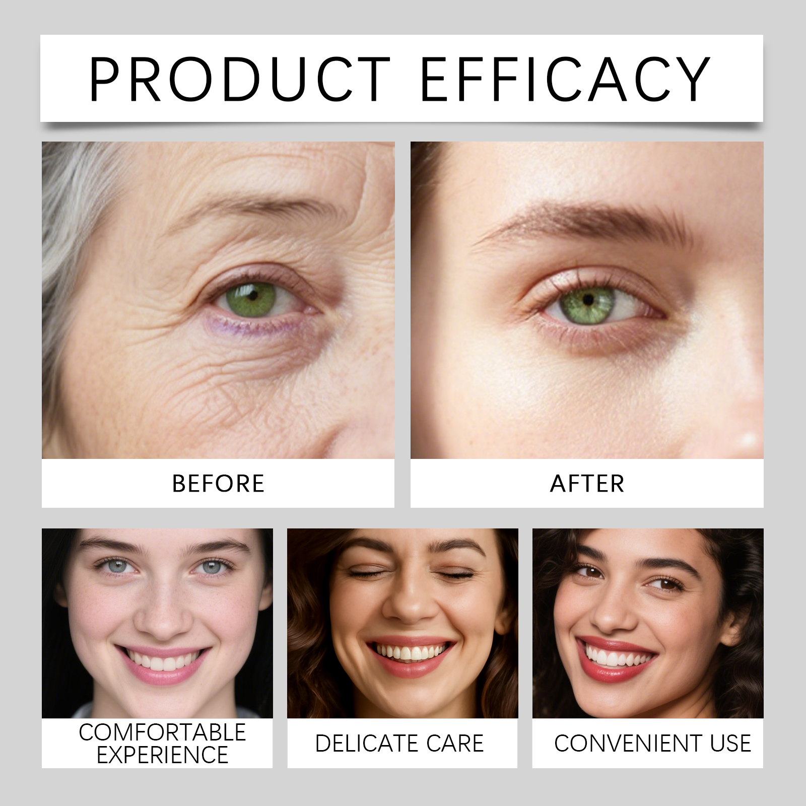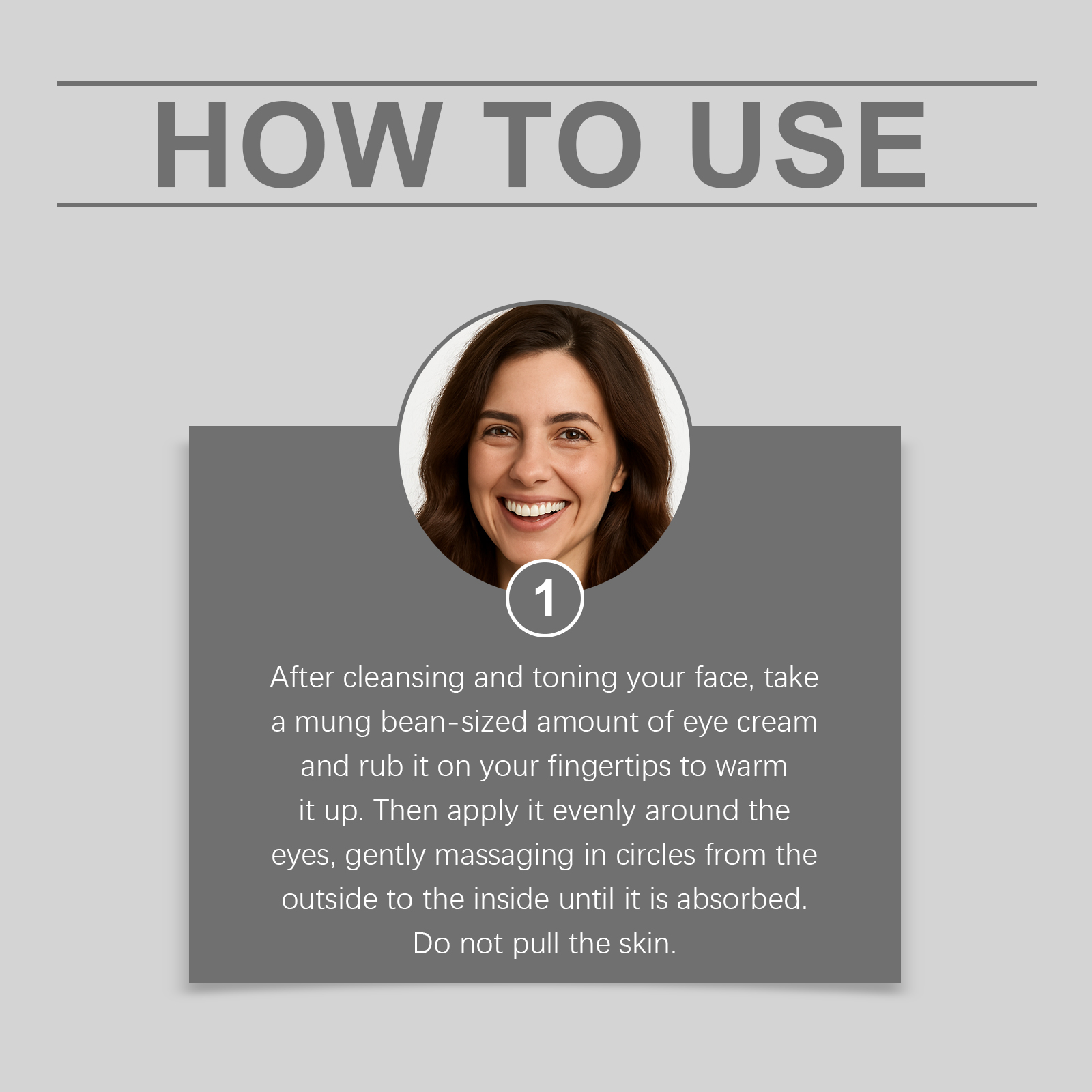 Our eye cream is carefully formulated with glycerin and glycerin stearate. Designed specifically for eye skin, it offers deep care and enhances radiance. The usage method is extremely convenient: After cleaning and conditioning your face, take a small amount of eye cream the size of a mung bean, rub it warm and apply it to your fingertips. Then apply it evenly around the eyes and gently massage in circular motions from the outer corner of the eye to the inner corner until it is fully absorbed. Never pull your skin. And it can tighten the skin around the eyes and help smooth out wrinkles.