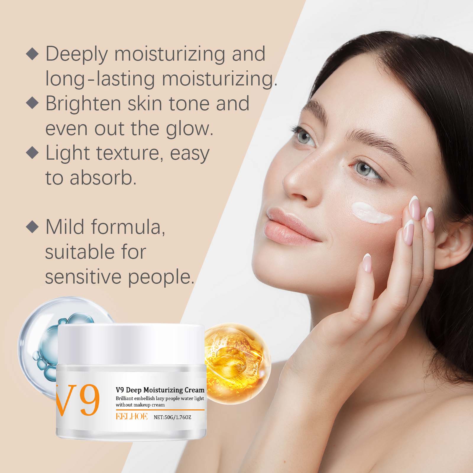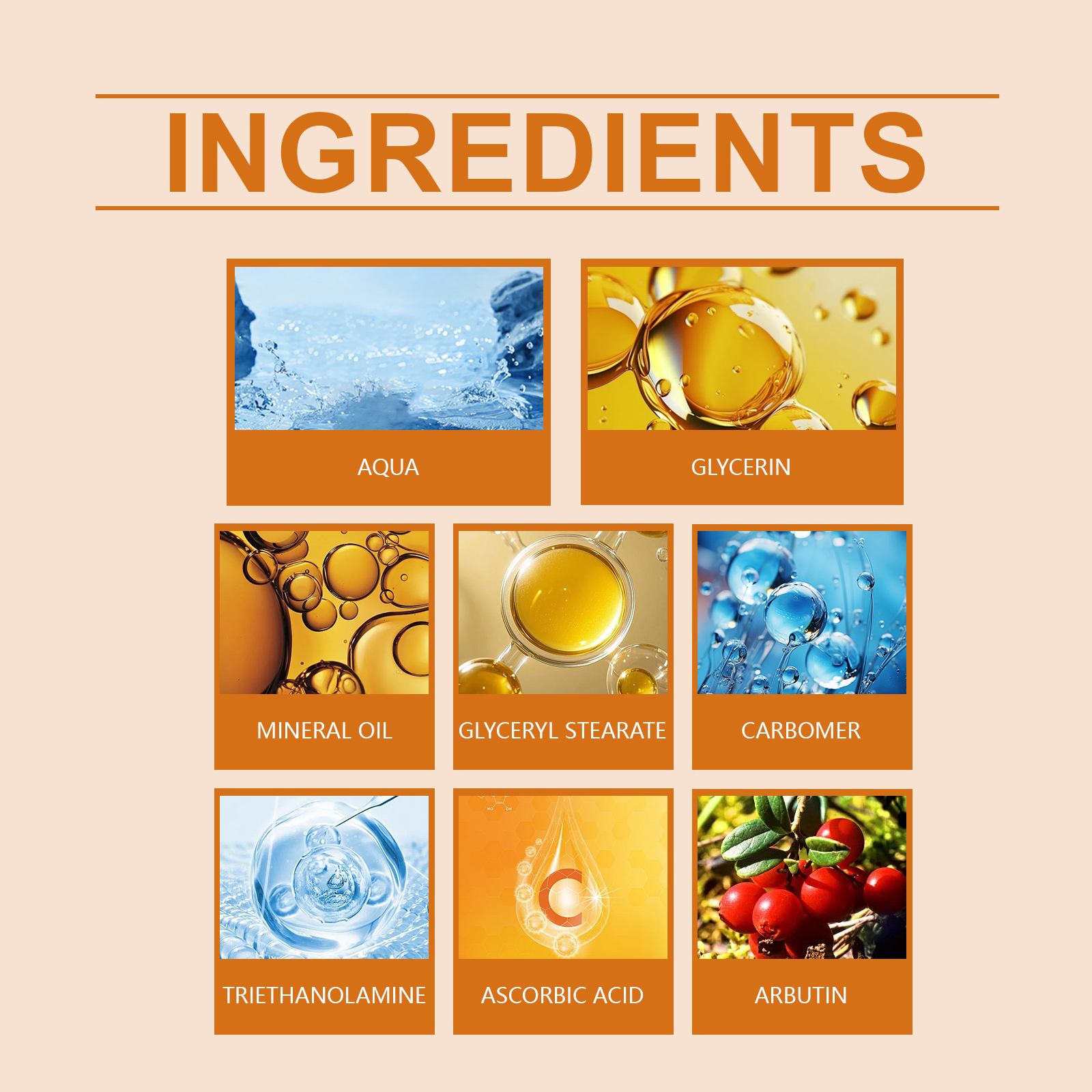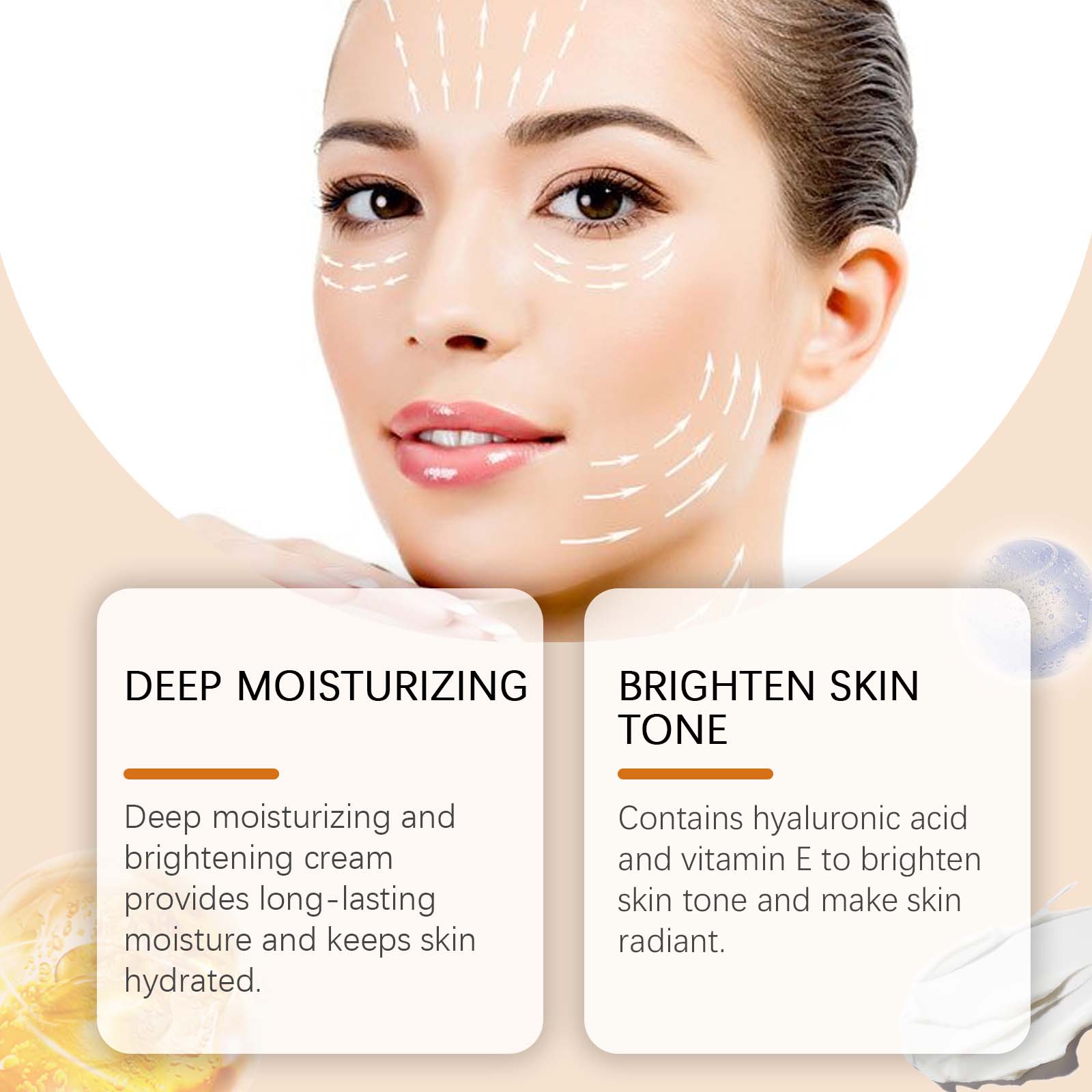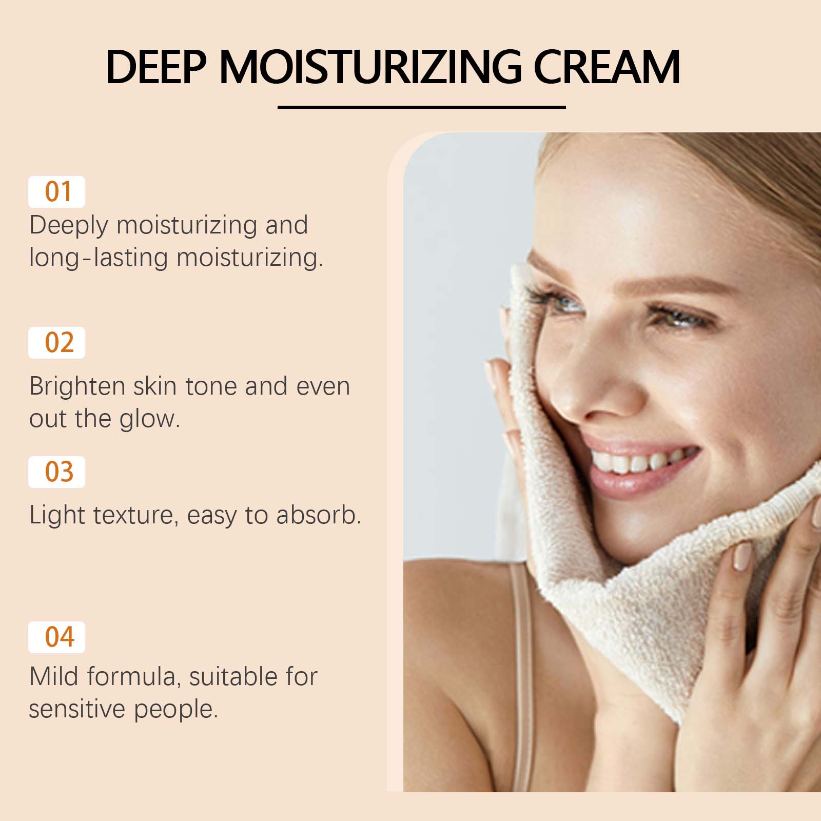 Our deep moisturizing cream contains ascorbic acid (vitamin C) and arbutin. It can contain hyaluronic acid and vitamin E, brighten the complexion and make the skin radiant. It has a light texture and is not greasy. Fast absorption, suitable for all skin types; The ingredients are mild, suitable for sensitive skin and safe to use. And there is also safe skin care. Its usage method is very simple: 1. Clean the facial skin and keep it dry; 2. Take an appropriate amount of this product and apply it evenly to the face. 3. Gently massage until fully absorbed. The Deep Moisturizing Brightening Cream provides long-lasting moisture and keeps the skin hydrated. Brighten the complexion and make the skin radiant.