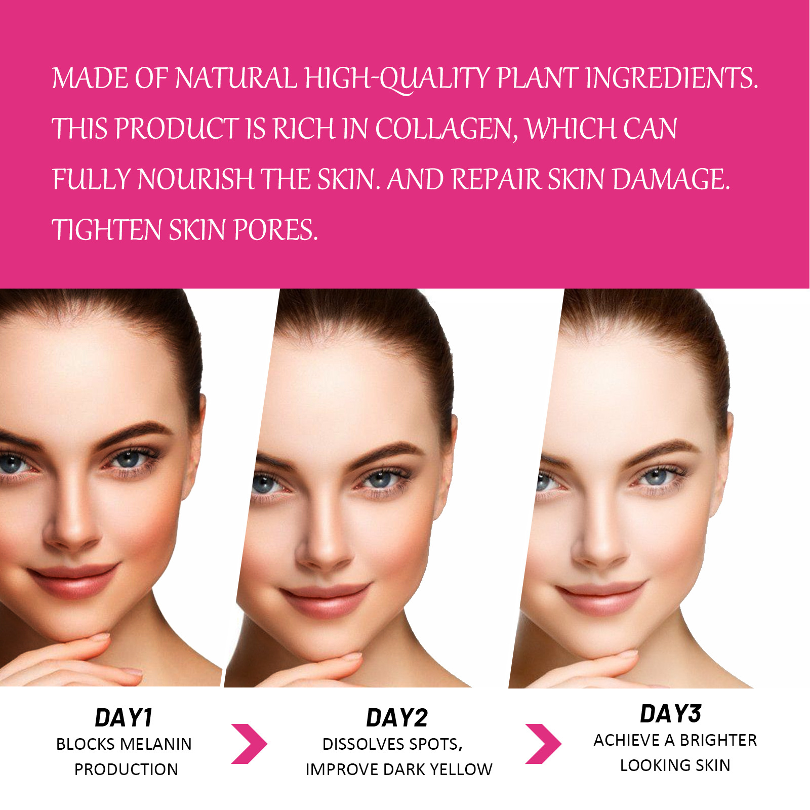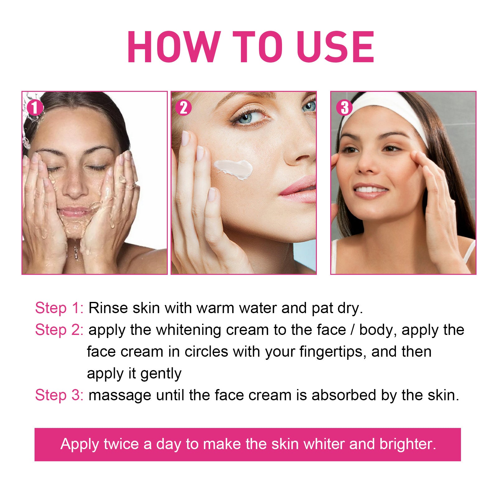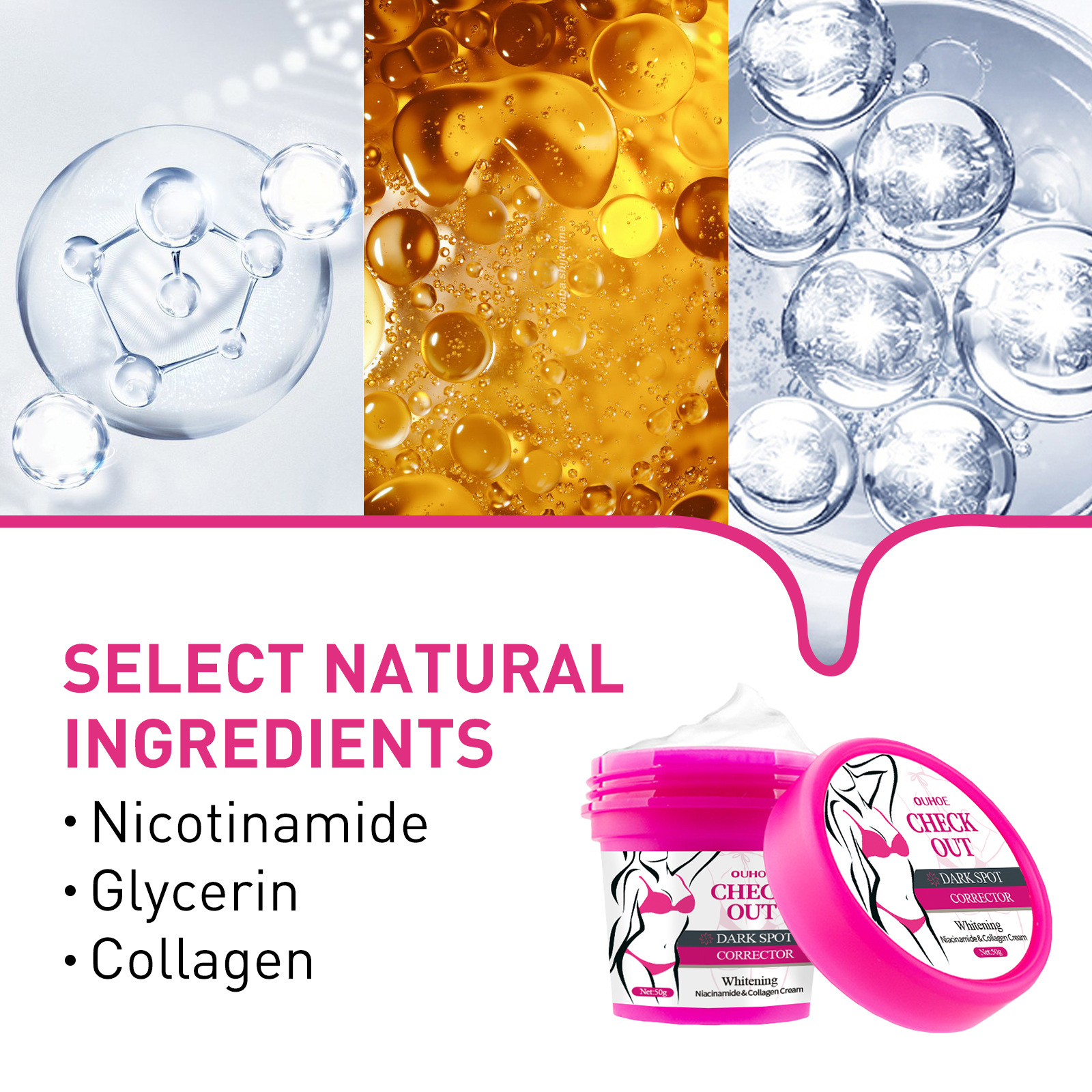 Our collagen cream contains glycerin, niacinamide and collagen. It can nourish the skin effectively. Repair skin damage. Tighten skin pores. Its use method is very simple: the first step: rinse the skin with warm water, pat dry; Step 2: Apply the whitening cream to your face/body, using your fingertips to apply the cream in a circular motion, then gently apply; Step 3: Massage until the cream is absorbed. Collagen cream blocks melanin production; Dissolve stains, improve dark yellow; Makes the skin look brighter.
